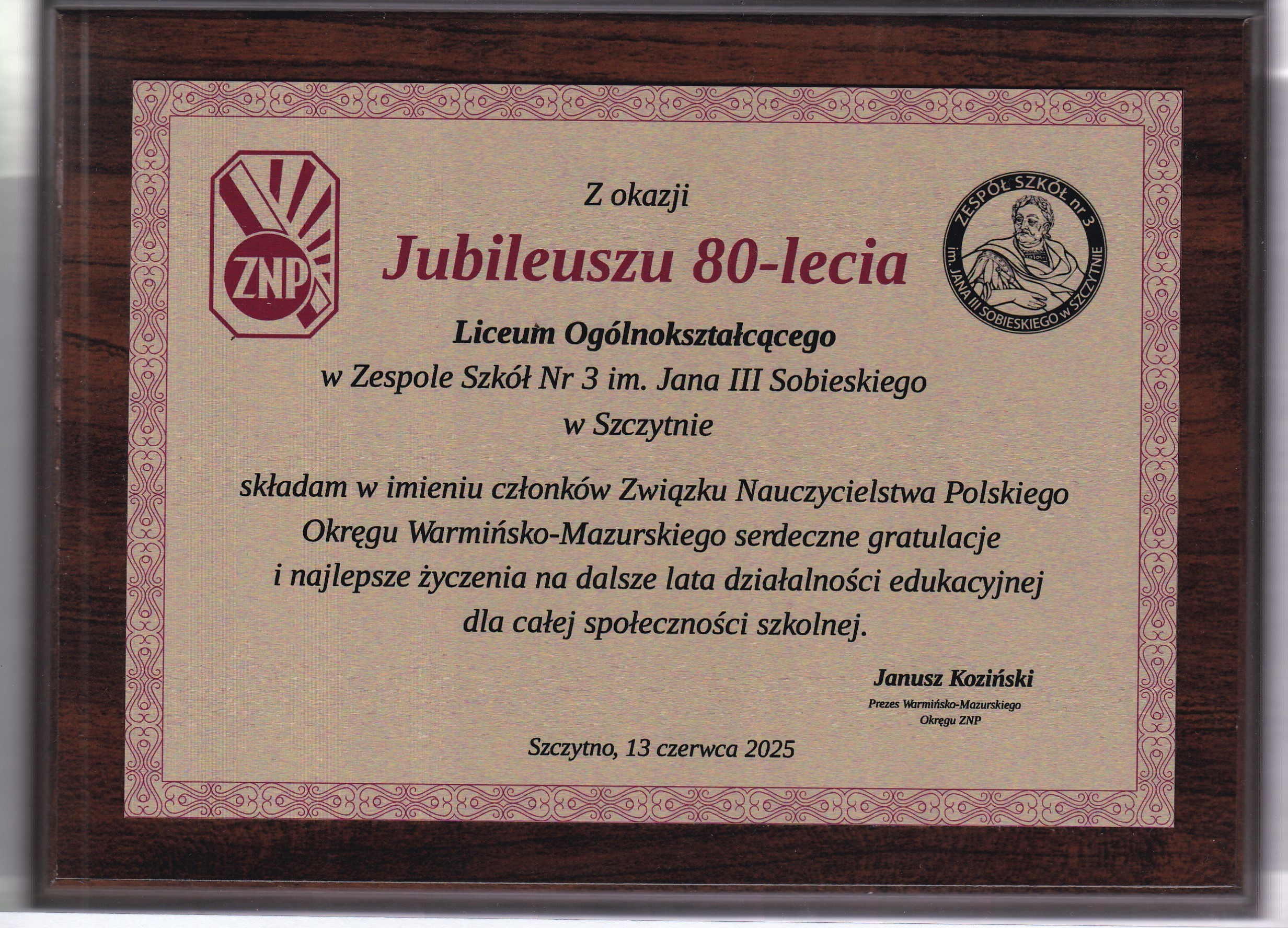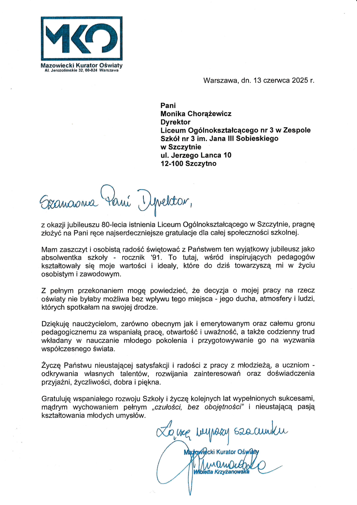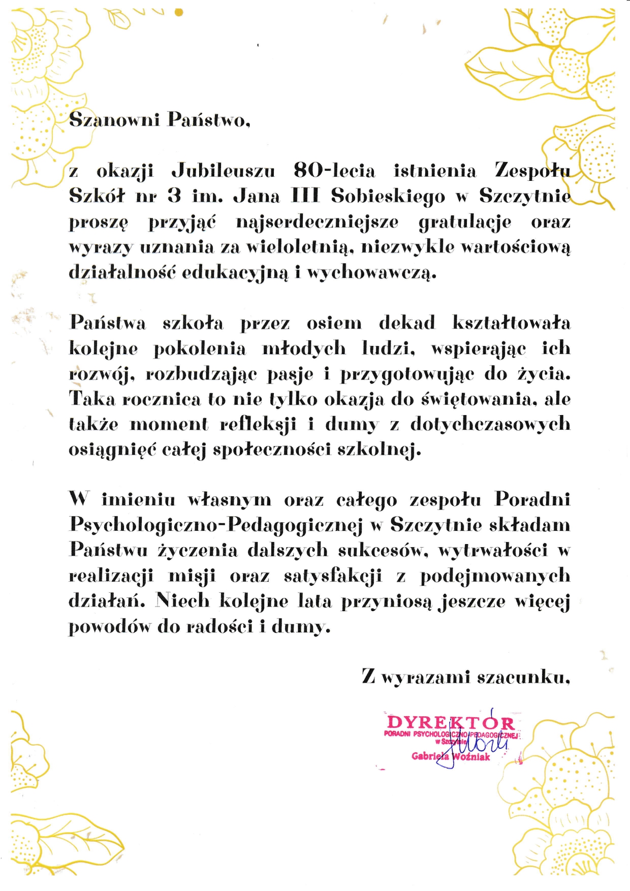Z ogromną radością zapraszamy na uroczyste obchody Jubileuszu 80-lecia naszej szkoły, które odbędą się 13 czerwca 2025 r. w budynku Zespołu Szkół nr 3 im. Jana III Sobieskiego w Szczytnie przy ul. Jerzego Lanca 10.