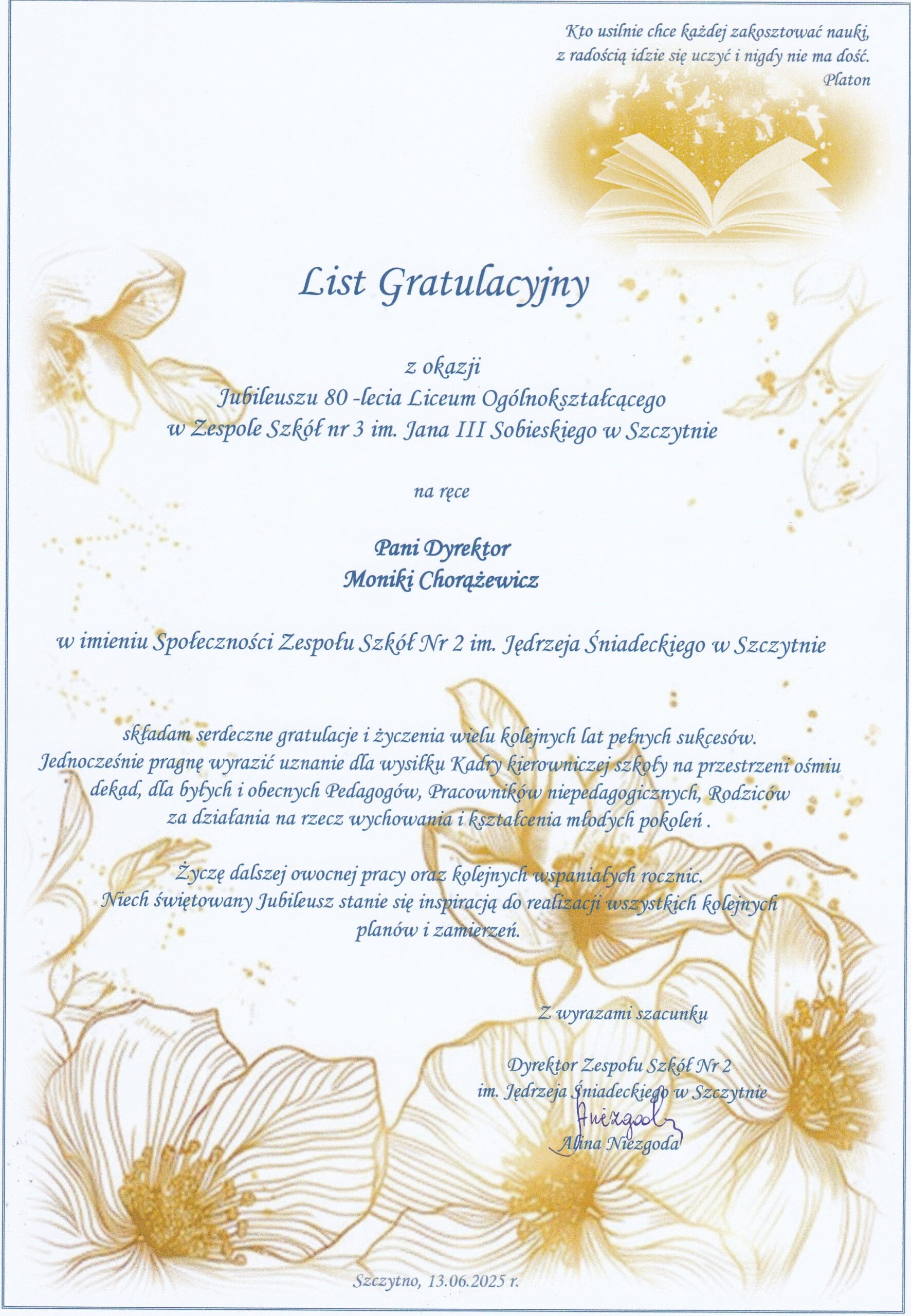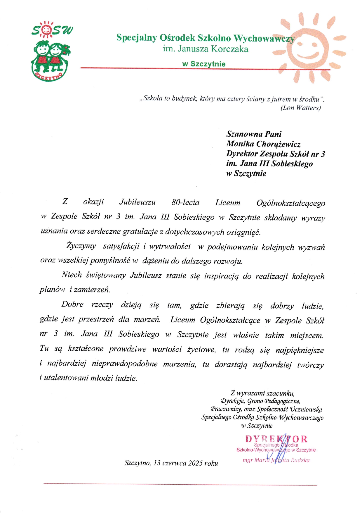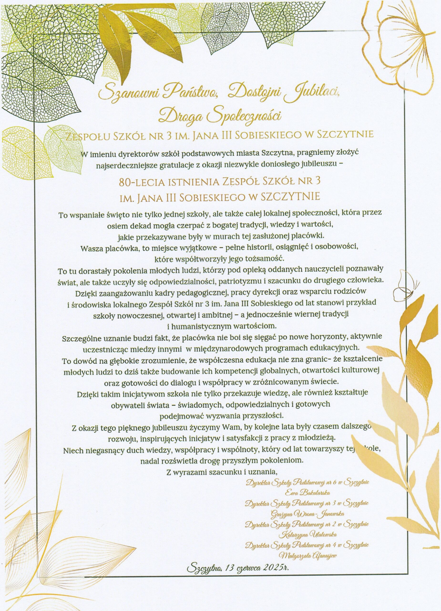 Z ogromną radością zapraszamy na uroczyste obchody Jubileuszu 80-lecia naszej szkoły, które odbędą się 13 czerwca 2025 r. w budynku Zespołu Szkół nr 3 im. Jana III Sobieskiego w Szczytnie przy ul. Jerzego Lanca 10.