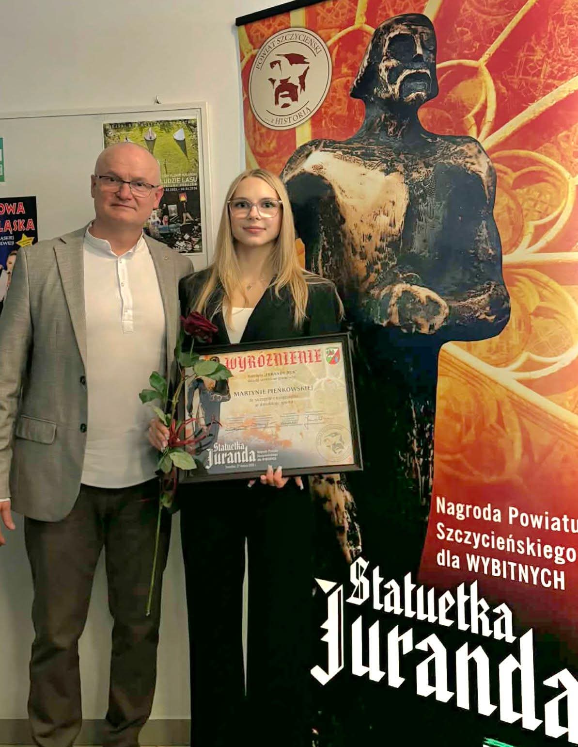 Nasza uczennica Martyna Pieńkowska z klasy 3C znalazła się wśród nagrodzonych mieszkańców naszego powiatu. Podczas Gali Nagród Juranda 2026 otrzymała wyróżnienie Juranda w dziedzinie sportu.