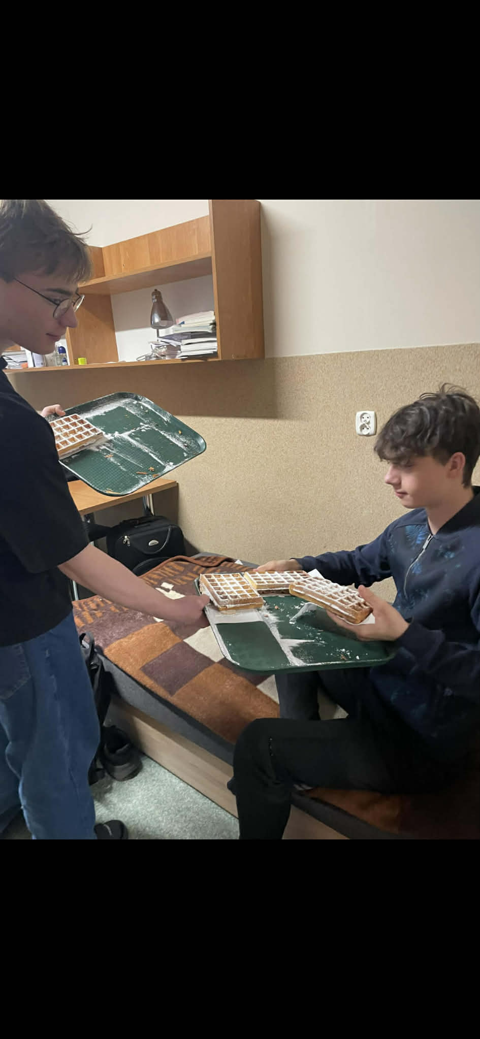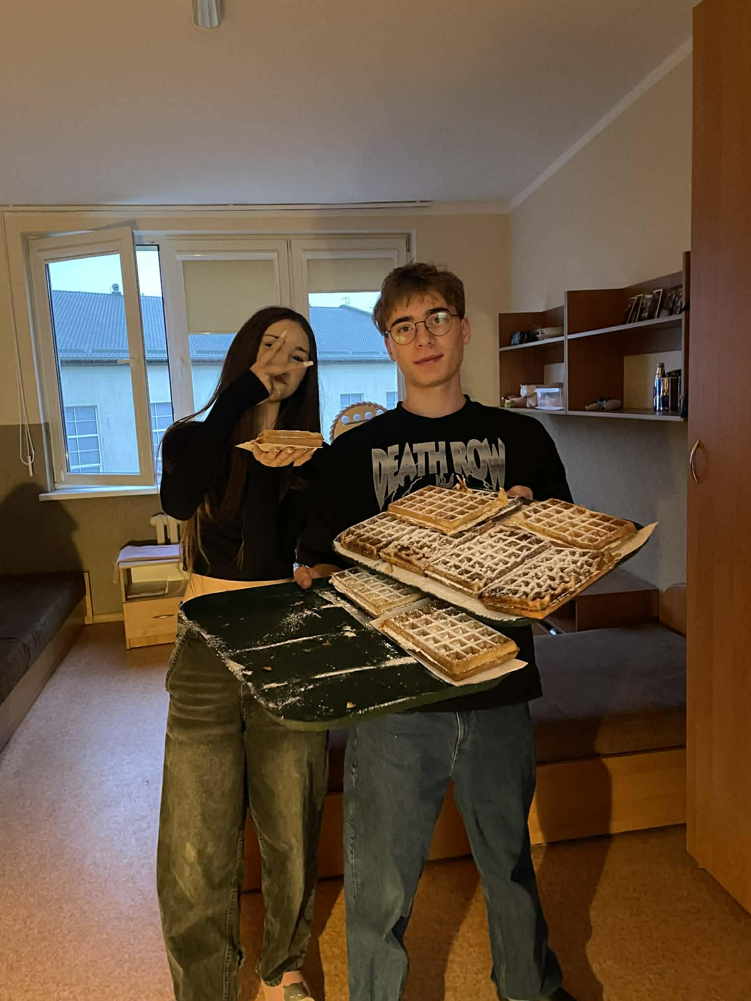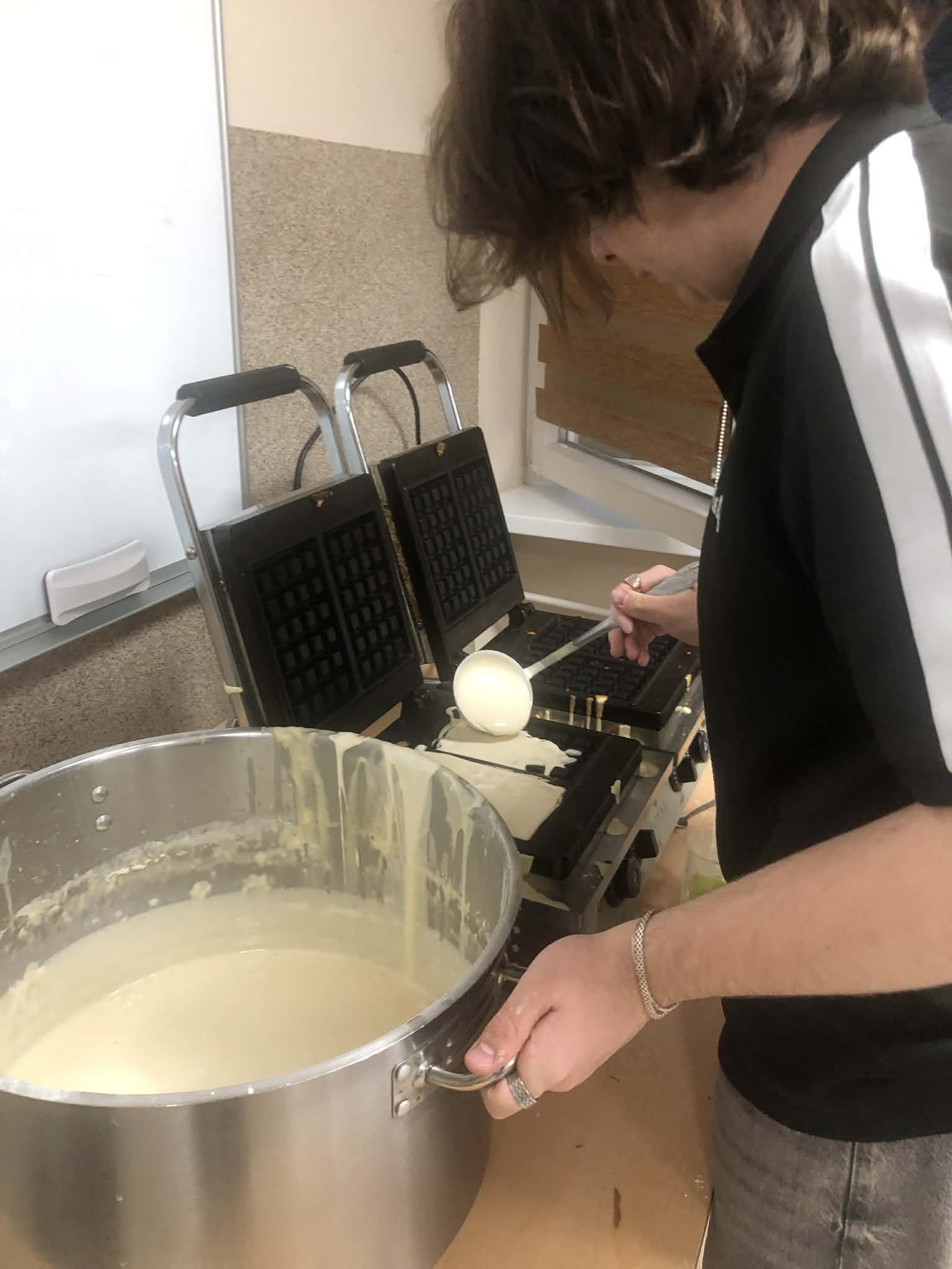 Nie obyło się bez drobnych przygód – ktoś wsypał odrobinę za dużo cukru, ktoś inny z dumą stworzył gofra w „artystycznym” kształcie, ale jedno było pewne: wszystkie smakowały wyśmienicie! Zapach świeżych gofrów unosił się po całym internacie, przyciągając kolejnych łasuchów. Było pysznie, radośnie i bardzo integracyjnie – aż chciałoby się, żeby Dzień Gofra był co tydzień!