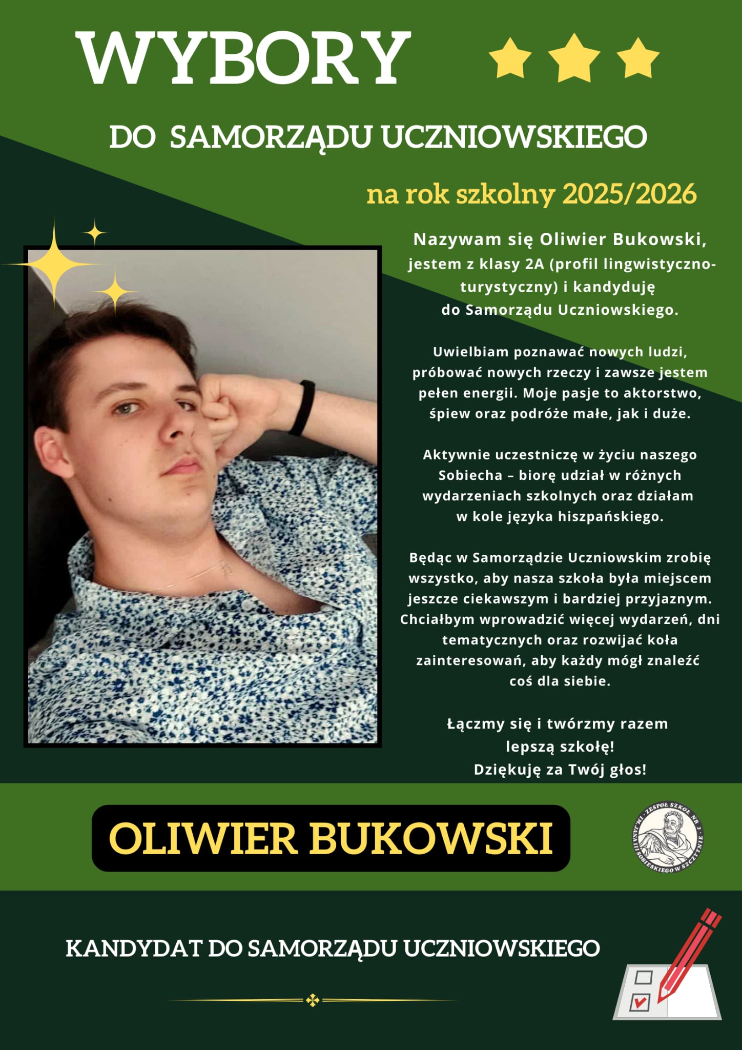 Przygotuj prezentację swojej kandydatury. Napisz w niej, co chciałbyś zmienić w życiu szkoły. Przedstaw swój program zachęcający do głosowania na Ciebie. Nie zapomnij o zamieszczeniu swojej fotografii, informacji, z której klasy jesteś oraz o Twoich zainteresowaniach i umiejętnościach.